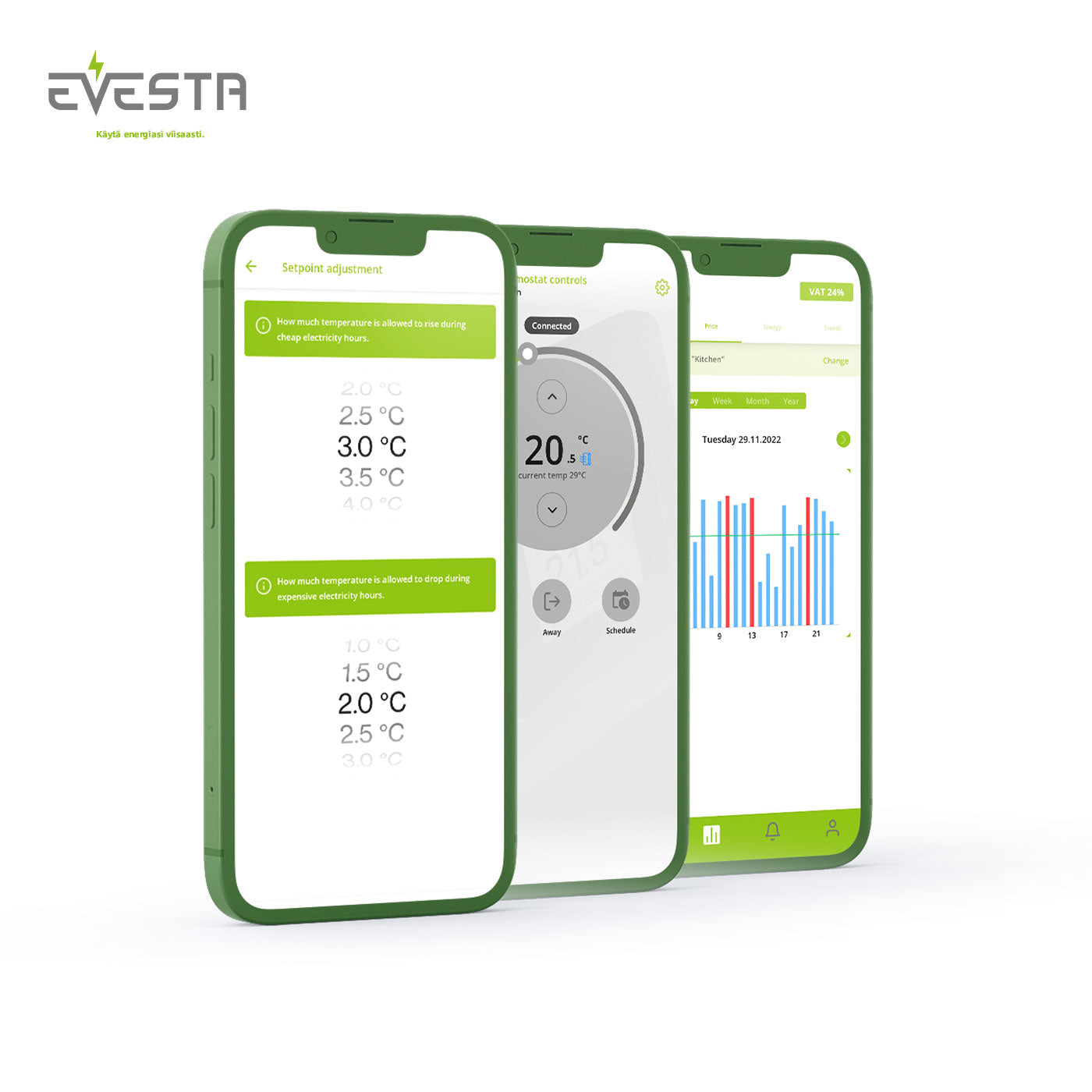 Evesta-sovelluksella voit optimoida lämmitystäsi yhteensopivilla termostaateilla. Sovelluksessa asetat miten monena tuntina vuorokaudessa termostaatti saa säätää sähkönkulutusta ylös- tai alaspäin, jonka jälkeen asetat lämmityksen raja-arvot. Raja-arvoilla päätät miten paljon lämmitys saa poiketa kohdelämpötilasta.
